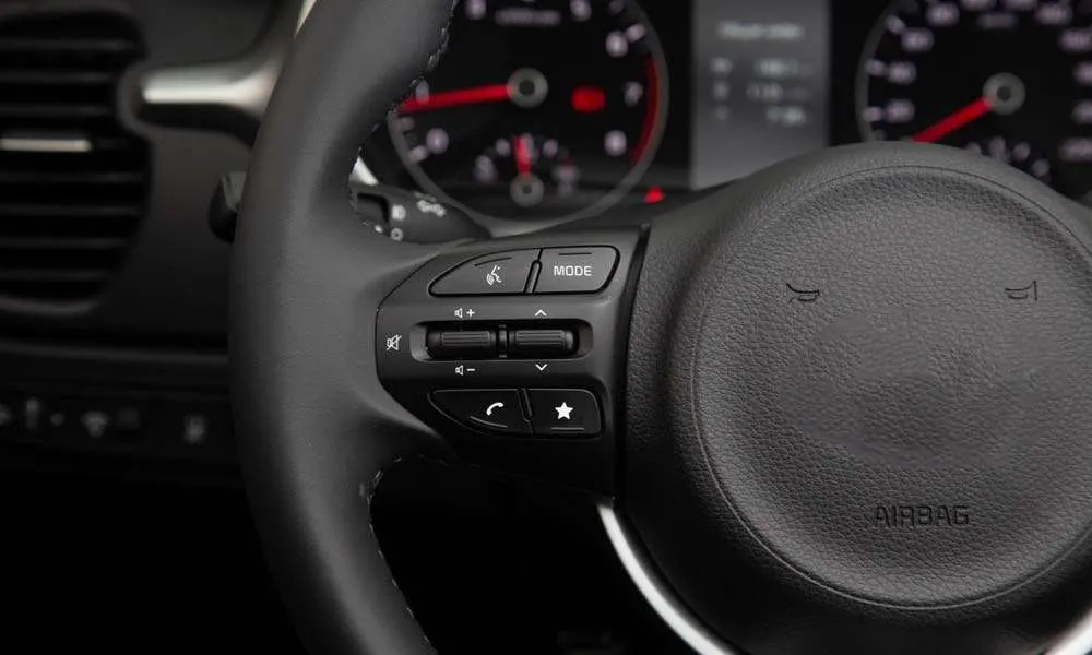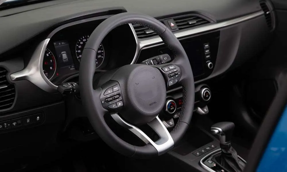 Селектор трансмиссии и рулевое колесо с красной прострочкой